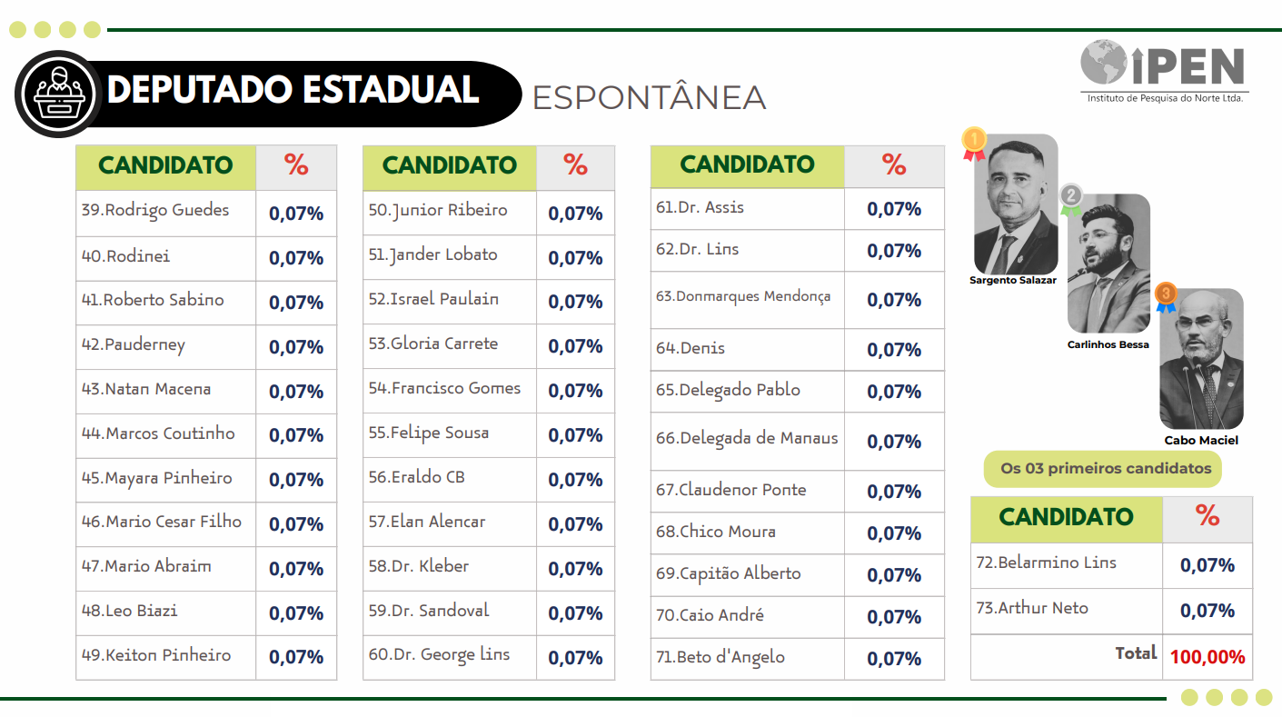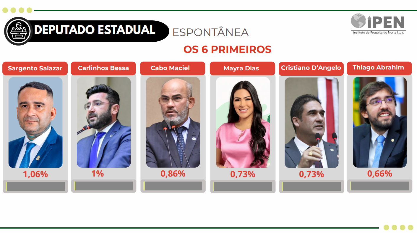 Em relação à Assembleia Legislativa, o vereador de Manaus Sargento Salazar (PL) aparece com 1,06% das intenções de voto, seguido pelo deputado estadual Carlinhos Bessa (PV), com 1%. O deputado estadual Cabo Maciel (PL) foi citado por 0,86%. Também foram mencionados Mayra Dias (Avante), com 0,73%, Cristiano D’Angelo (MDB), com 0,73%, e Thiago Abrahim (União Brasil), com 0,66%.